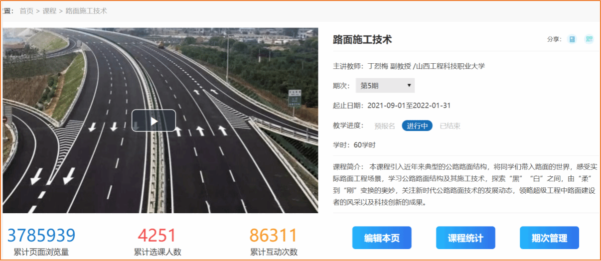 2019年,丁烈梅以优质校建设为契机,主持完成了在线开放课程建设,并上线学银在线平台,目前已运行至第5期,累计选课人数4251人,互动86311次。各知识点和技能点配套开发了微课视频、文稿精读、章节测验、施工视频或动画、学习任务单、思政素材、拓展阅读、电子教材等资源,为在校学生和社会学习者提供了丰富的线上学习资源,对线上线下混合式教学与翻转课堂的开展起到了积极作用。同时,配套开发的教材《路面施工技术》(第2版)被评为“十三五”职业教育国家规划教材。