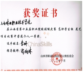 2021年11月我代表学院参加了山西省第十五届职业院校花艺项目技能大赛。从开始的花束架构不稳、花束捆绑不牢、花材搭配不当到最后做出一束合格的花束,我不记得经历了多少次的破与立。每一个作品在不断地推翻、重立、打磨之后,方才呈现出我心中的最美的姿态。每一次的练习,不仅提升了花艺水平,还让我更加勤于思考、坚强果敢。日渐成熟的造型、熟练的技法、提升的速度,也越发让我散发出自信的光芒。赛场上,我操作更加熟练,心态也更加平稳。最终,我以第一名的成绩获得了山西省第十五届职业院校技能大赛高职学生组花艺项目个人一等奖。