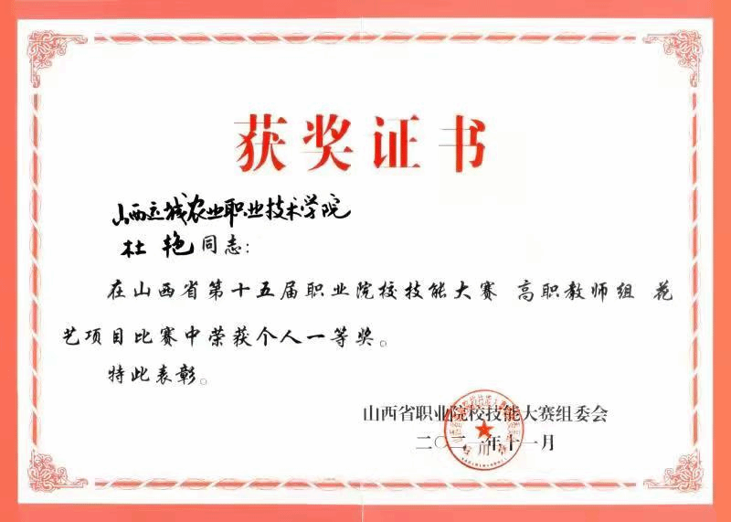 2017年带领学生参加山西省职业院校“园林植物识别”大赛获得三等奖;2019年、2020年、2021年带领学生参加山西省职业院校技能大赛花艺赛项,多次获得一、二等奖;2019年荣获运城市优秀教师技能大赛职教组二等奖;2021年参加山西省第十五届职业院校技能大赛花艺赛项(教师组),荣获得赛项第一名。