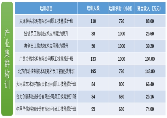 1. 精准定位企业开展职工培训、为高质量转型发展提供技术技能人才支撑。一年来,我院发挥大数据高水平专业群、材料工程专业群、智能制造专业群的优势,对接信创产业集群、节能环保产业集群和煤机智能制造产业集群等8个企业职工的培训需求,针对在岗职工技能提升、企业新入职员工和一线操作工等举办了八个培训班,共培训739人,3900课时。培训内容涵盖了水泥厂水泥生产一线、中央控制室操作、化验室物理化学检验、 烟气脱硫脱硝、水泥窑协同处置废弃物、余热发电;软件技术开发、信息安全、职业素养、企业管理、智能制造规划、精益管理、智能制造技术、工业机器人、自动化、工业互联网、物联网、人工智能、无人机、大数据、芯片集成等。培训收入近600万元,实现社会效益与经济效益同步增长。