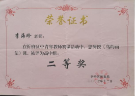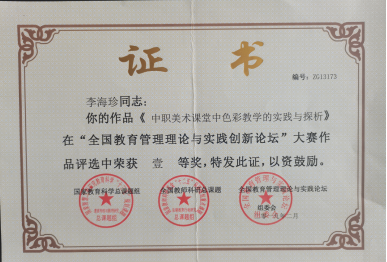 2019年2月,李老师撰写论文《中职美术课堂中色彩教学的实践与探析》并获得全国教学管理理论与实践创新论坛大赛一等奖。