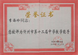 在这种良好的教学模式下,李老师获得了“忻州市第十二届中学教学能手”和忻府区“三八红旗手”荣誉称号。