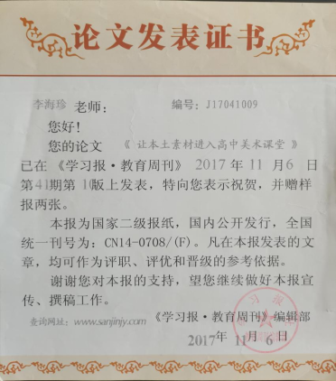 2017年11月,李老师撰写论文《让本土素材进入高中美术课堂》发表于《学习报·教育周刊》并在国内公开发行。