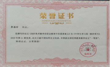 2020年,李老师撰写论文《浅析美术教学在职业教育中的重要意义》发表于《中学生学习报·教研周刊》,并被中国知网全文收录,获得了全国优秀教学论文一等奖。