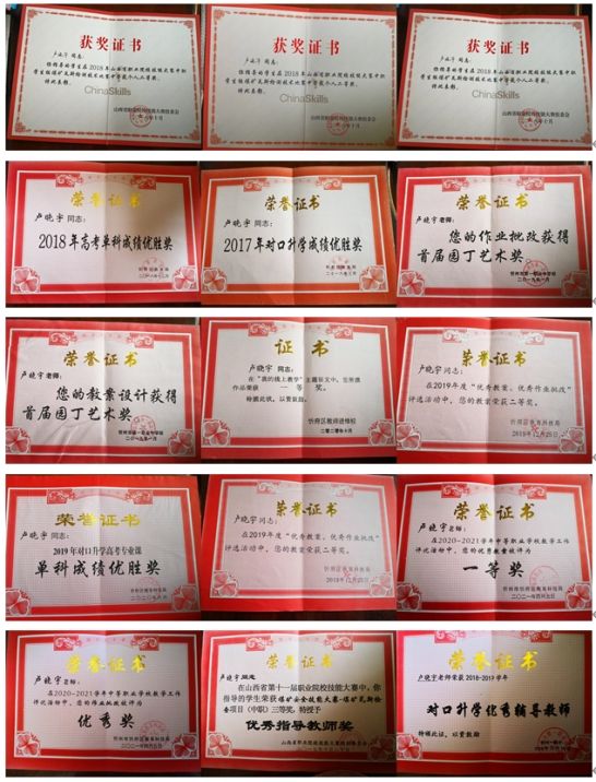 在多年教学实践当中,卢晓宇所带专业课硕果累累:2017年获山西省职业节能大赛“优秀指导教师奖”;2018年指导学生获山西生职业技能大赛个人二等奖;2019年获教案设计、作业批改获园丁艺术奖,对口升学优秀辅导教师;2020年获“我的线上教学”主题征文一等奖;2021年获优秀教案一等奖、作业批改一等奖,“课题研究先进个人”称号;2022年获 “三八妇女节”征文比赛三等奖;在2018——2020连续三年荣获对口高考单科成绩优胜奖,对口升学成绩优胜奖。