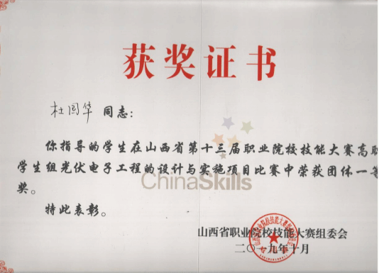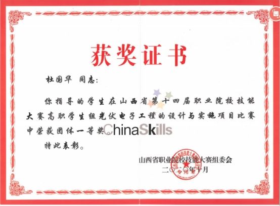 杜国华,1983年生,研究生学历,2008年参加工作。维修电工技师,考评员,晋城职业技术学院机电一体化技术专业主任。参加工作以来参编教材2部,发表专业论文9篇,主持参与省级校级课题10余项,申请实用新型专利6个。指导学生在技能大赛中获国家奖3项,省级奖6项。2017年荣获“晋城市优秀教师”,2020年晋城职业技术学院“优秀党员”“十大师德标兵”。