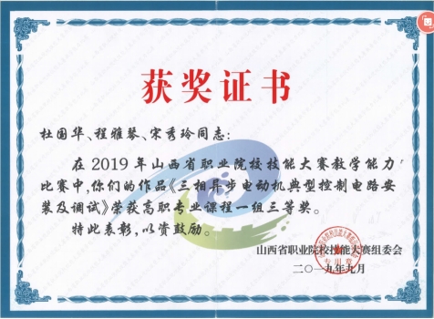 宋秀玲,女, 1976年9月出生,山西省高平人,学历本科,系我院机械电子工程系教师、维修电工技师,国家职业技能鉴定考评员、技能大赛优秀指导教师。2018年指导学生参加山西省业技术学院技能大赛“自动化生产线安装与调试”项目获一等奖。2019年指导学生参加山西省业技术学院技能大赛“机电一体化项目”项目获一等奖。2020年指导学生参加山西省业技术学院技能大赛“机电一体化项目”项目获二等奖。曾主编写专业教材《PLC应用技术》。实用新型专利2项。