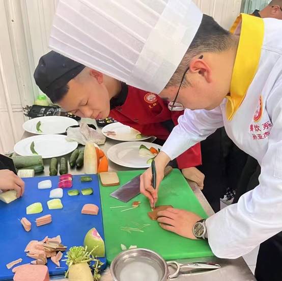 参加比赛不仅是对学生的职业技能的体现,更是在检验一个指导教师的职业素养。因为疫情原因,他每天给学生不断的做思想工作,努力让他们在家学习训练。每天反复的强调安全问题和训练注意事项,和学生奋战在训练一线。冷拼与雕刻项目中主题拼盘和自选雕刻作品十分的考验作品的新颖创意。孙亚杰老师通过不断的去研究、创新,在设计作品时融入新的题材。在设定完题材以后,他格外还要注重颜色的搭配。制作出初稿以后他精益求精,修改调整,同时听取他人的建议,最终终于呈现出一个他心目中完美的作品。